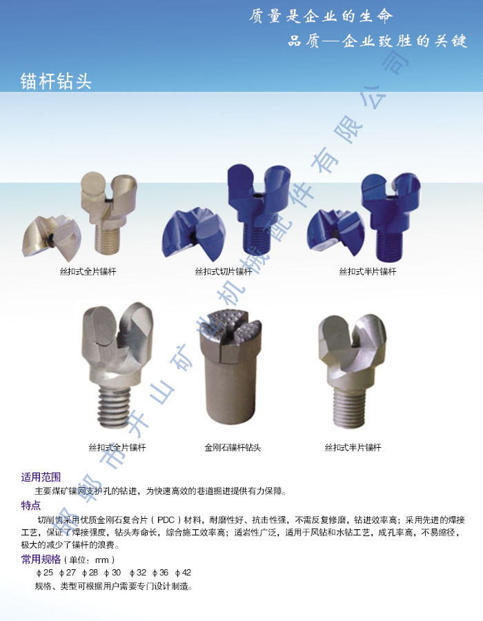 錨桿鉆頭是煤炭部推廣的三小產(chǎn)品,有27mm、28mm、30mm、32mm四種規(guī)格。在三小產(chǎn)品的基礎(chǔ)上根據(jù)用戶要求可定做36mm、40mm、42mm型錨桿鉆頭,配合各種26mm-40mm麻花鉆桿和錨桿鉆機(jī)配套B19、B22中空六角鉆桿時(shí)使用,Ⅰ型適用于軟巖,Ⅱ型適用于硬巖和堅(jiān)硬巖石鉆孔。